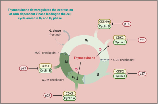 TQ prevents carcinogenic intermediate synthesis by inhibiting the G2/M phase of the cell cycle. It also inhibits ROS-mediated DNA damage to prevent tumorigenesis. TQ upregulates pro-apoptotic genes (p21 and p27) and downregulates the anti-apoptotic gene (Bcl-2), thereby arresting the G2/M phase of the cell cycle. (CDK—cyclin-dependent kinases; CYP—cytochrome P; TQ—Thymoquinone).
