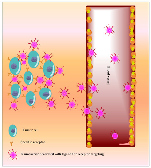 A variety of surface receptors have been found to be upregulated in certain physiological conditions, including cancer, and are widely utilized for delivery via surface-decorated nanoparticles (NPs). The surface-coated NPs can target those cells which overexpress specific receptors on their surface and because of this, the nanoparticles attach to these [10]. The same is shown in Figure 6. The ligands which are used for surface modification include hyaluronic acid, anisamide, transferrin, folic acid, and many more utilized for active targeting of TQ into cancer. These have been reported in the following sections. This receptor is overexpressed in various types of cancers, including colon, brain, breast, lung, prostate, and kidney [189,190]. Anisamide is a benzamide analog, which exhibits a higher affinity towards sigma receptor-expressing cells [191] Anisamide-conjugated polymeric nanocapsules of eudragit-S100 delivered TQ into the colon-specific region through binding with overexpressed colonic sigma receptor [192]. The RNA aptamer, A10-coated planetary ball-milled starch NPs of TQ exclusively delivered drug into docetaxel-resistant prostate cancer cell lines (C4-2B-R and LNCaP-R) through overexpressed prostate-specific membrane antigen and inhibited drug efflux, which improves cancer potential [193]. The PEG and PCL, in the ball-milled NPs, decrease non-specific binding to the cell membrane and allow prolonged circulations. Hyaluronic acid (HA)-decorated Pluronic® NPs of TQ accumulated in TNBC cells through selective binding with overexpressed CD44 receptor of cancer cells [194]. Pluronic-enhanced TQ encapsulation and HA facilitate CD44 targeting and make it have prolonged circulation, which reduced the dose for cell migration by modulating both miR-361/Rac1 and RhoA/actin stress fibers and the miR-361/VEGF-A mechanism that attenuate angiogenesis and metastasis of TNBC cells. Radio-iodinated NPs of folic acid-chitosan specifically bind to overexpressed folate receptors of human ovarian cancer cells (SKOV3) and improve anticancer efficacy through improved cellular internalization and retention [195]. A PEGylated-PLGA-TQ-NP surface decorated with transferrin potentiated anticancer efficacy of TQ through specific binding with the overexpressed transferring receptor on tumor cells, which decreases dose and improved cellular accumulations of NPs through EPR, as investigated in lung carcinoma A549 cells [196]. The as1411-conjugated nanodroplets delivered TQ into cancer cells through specific binding with overexpressed nucleolin on the cancer cells surface as investigated in MDA-MB-231 cells [197]. The as1411-conjugation facilitates rapid cellular uptake and dose-dependent cytotoxicity via nucleolin-stimulated Rac1 activation [198].