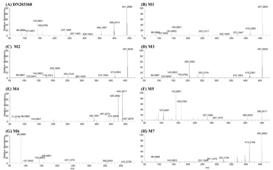 Product ion scan mass spectra of DN203368 (A) and its seven metabolites; hydroxy-DN203368 ((B–D), M1–M3), DN203368-N-oxide ((E), M4), N-desisopropyl-DN203368 ((F), M5), N,N-desalkyl-DN203368 ((G), M6), and DN203368 quinone ((H), M7).