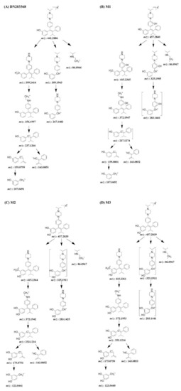 MS/MS fragmentation schemes for DN203368 (A) and its seven metabolites; hydroxy-DN203368 ((B–D), M1–M3), DN203368-N-oxide ((E), M4), N-desisopropyl-DN203368 ((F), M5), N,N-desalkyl-DN203368 ((G), M6), and DN203368 quinone ((H), M7).