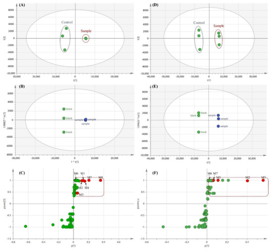 Multivariate data analysis of DN203368 metabolites in rat liver microsomes (RLM, (A–C)) and human liver microsomes (HLM, (D–F)). Score plots generated by a principal component analysis (A,D) and orthogonal partial least-squares discriminant analysis (B,E); loading S-plot generated by an OPLS-DA for RLM (C) and HLM (F). The p(corr)(1) values represent the interclass difference, and the p(1) values represent the relevant abundance of ions. Data processing and model construction are described in the Materials and Methods. Metabolites of DN203368 are labeled in the S-plot.