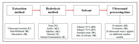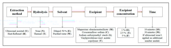 The samples in Table 2 are coded according to their conditions (Figure 3). The first letter of the sample indicates the extraction method; the second, the hydrolysis method; the third, the solvent; the fourth, the excipient; and the fifth, the excipient concentration and the number show ultrasound processing time (if ultrasound was not applied, no additional number was added).