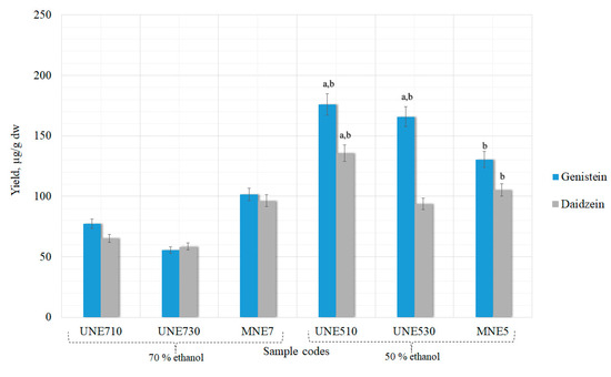 Influence of UAE treatment time and solvent concentration with acidic hydrolysis on the maximal extraction yield of genistein and daidzein in extracts. a p < 0.05 vs. maceration with 50% ethanol (MNE5); b p < 0.05 vs. maceration with 70% ethanol (MNE7). Sample codes and preparation conditions are displayed in Table 1.