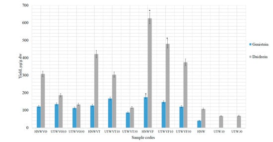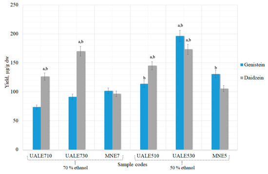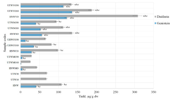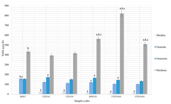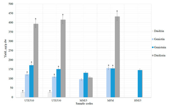 Low amounts of the glycosides genistin and daidzin were obtained in the samples; their yields were statistically insignificant (p > 0.05). Therefore, they are not shown in the graph.