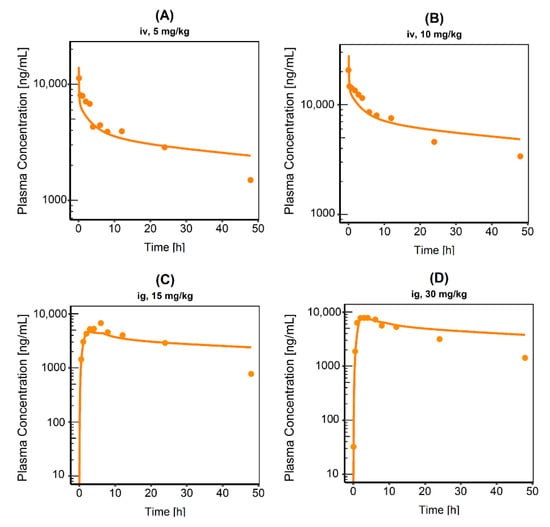 Semi-logarithmic plots of plasma concentration time profiles following (A) 5 mg/kg intravenous (iv), (B) 10 mg/kg iv, (C) 15 mg/kg intragastric (ig) or (D) 30 mg/kg ig administration of CAB. Observed data are shown as dots, simulations are shown as lines. All data extracted from Wang et al., n = 8 in every case.