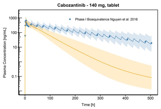 The final PBPK model also included an active MRP2 transport process and CYP3A4 metabolism, two main features characterizing CAB PK and representing possible sources of DDI and resistance [18,41,53]. CAB is mainly used in advanced disease states, e.g., in hepatocellular carcinoma, where co-administration of several additional drugs is not uncommon and several authors [9,54] discussed this issue. Interactions with strong CYP3A4 inducers (e.g., Rifampin) or inhibitors (e.g., Ketoconazole) can lead to decreased or increased CAB plasma concentrations, which may require closer monitoring and dose adjustment [41]. The developed model was used to simulate DDI with RIF and confirmed a decrease of 77% in plasma exposure, when RIF is co-administered with CAB. The model adequately describes the CAB RIF DDI plasma concentration time profile and is in good agreement with the observed data. The correct prediction of the impact of the perpetrator drug indicates the correct implementation of the relevant elimination pathways of the victim drug and the right amount of drug eliminated via that pathway [55]. After a single dose administration, it was not possible to match AUClast values of the control data by only increasing the amount of the single dose, as in that case, Cmax will also strongly increase, which could have an impact on safety. However, CAB accumulates five-fold by day 15 following daily dosing based on AUC, which should be considered in the treatment of these patients. As no clinical data after multiple-dose administration were available, predicted Css after multiple dosing for the 60 mg tablet was compared to the Css published by Castellano et al. [56], to evaluate the ability of the model to simulate multiple dosing correctly. A good agreement between the predicted and published value was found (1197 ng/mL vs. 1123 ng/mL). Steady state simulations for CAB co-administered with RIF indicate that a dose increase by 20 mg (tablet) and 40 mg (capsule), respectively might not be sufficient to achieve the corresponding CAB plasma levels observed without perpetrator. Hence, the model presented in this work cannot confirm, that the dose increase recommended by FDA will lead to equivalent Css (Figure S10). It may be for this reason that EMA advises against using a strong CYP3A4 inducer, when patients are treated with CAB to avoid subtherapeutic plasma concentrations. However, there may be situations where it is clinically necessary to co-administer both substances and slightly lower CAB plasma levels are still sufficient. To counteract CAB Css that are far below the desired threshold, it might be valuable to conduct therapeutic drug monitoring in patients treated concomitantly with CAB and a strong CYP3A4 inducer like RIF.