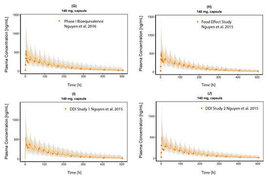 CAB plasma concentration time profiles (linear). (A) 140 mg CAB oral solution from a mass balance study, (B–D) data from a Phase I study CAB as tablet in 20, 40 and 60 mg oral single dose, (E) CAB 100 mg oral single dose as tablet in a PPI effect study, (F,G) 140 mg CAB as tablet an capsule formulation from a bioequivalence study, (H) 140 mg CAB oral single dose as capsule formulation from a food effect study, (I,J) 140 mg CAB oral single dose as capsule formulation from DDI studies with Ketoconazole and Rifampin. Observed data are shown as orange dots. Population simulation (n = 100) geometric means are shown as orange lines; the shaded orange areas represent the predicted population geometric SD. The shaded grey areas represent the 5% to 95% prediction interval.