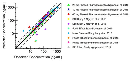 To evaluate the predictive performance of the model, multiple methods were used [20,34,35]: Visual inspections between observed and simulated plasma concentration time profiles were carried out initially. In addition, predictive performance of the PBPK model was analysed by generating goodness-of-fit plots in which the predicted plasma concentrations was plotted against their corresponding observed values according to the EMA guideline on the reporting of PBPK modelling and simulation [34]. Predicted maximum concentration (Cmax) and the predicted area under the systemic drug concentration–time curve from time zero to the time of the last concentration (AUClast) were compared to the respective literature values. Model accuracy and precision was described by using prediction error (PE), mean prediction error (MPE) and mean absolute prediction error (MAPE). The calculations were made according to Equations (1)–(3).