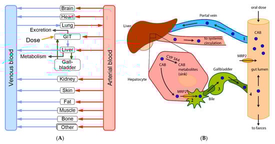 CAB is used in cancer patients and several other alterations regarding physiology are possible, both because of the disease itself or due to co-medication, and could be adapted in the developed model as it was done for liver cirrhosis [62]. EHC process, CYP3A4 and MRP2 expression and activity can be modified, and the model can, therefore, serve as a starting point to transfer the results to populations of interest. Comorbidities like cholecystitis, cholestasis or cholelithiasis but also diabetes mellitus and renal diseases could influence enterohepatic circulation directly or indirectly and might be subject of future questions [57]. As already stated, CAB plasma levels could be altered through its affinity to MRP2 transporter and it is conceivable to investigate situations, which could lead to alterations in MRP2 expression, like cholestatic liver diseases [63,64,65], based on the presented model. Concomitant use of drugs that inhibit MRP2 transport could result in higher plasma concentrations whereas an overexpression of MRP2, e.g., in specific tumours or due to a concomitant use of pregnane X receptor ligand (e.g., Phenobarbital) might lead to the opposite [64,66,67,68] effect. Both scenarios are more than unfavourable for the patients, as they either can suffer from side effects or less efficacy. As DDI based on the CAB CYP3A4 metabolism are very important, with more data becoming available in the future, the model might be used as a basis for further investigations regarding relevant DDI and the associated dose adaptations.
