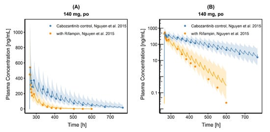 Cabozantinib plasma concentration time profiles in linear (A) and semi-logarithmic (B) representation after a single oral dose of 140 mg Cabozantinib (capsule formulation) without and with rifampin co-administration. Observed data are shown as dots. Population simulation (n = 100) geometric means are shown as lines; the shaded areas represent the predicted population geometric SD.