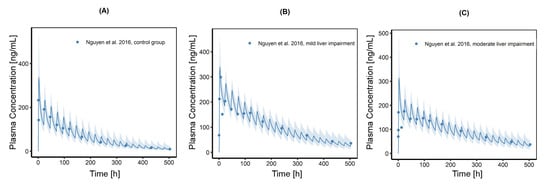 With that, the model could be extended to simulate the plasma exposure in patients with mild and moderate liver impairment. Liver diseases can affect several morphological and physiological processes and may have an impact on enterohepatic circulation and biliary excretion. A decreased uptake into hepatocytes, an altered metabolism, and distribution within the hepatocytes as well as reduced transfer mechanism into bile is conceivable. Especially cholestasis can have a significant influence on hepatobiliary excretion, either through biliary obstruction (e.g., caused by duct stones or pancreatic carcinoma) or transporter defects and downregulation, respectively (e.g., strong downregulation of canalicular MRP2). However, patients in the study of the effect of hepatic impairment on CAB PK were not affected by cholestasis but by liver cirrhosis only [37]. According to Roberts et al. [57], liver cirrhosis rather affects sinusoidal membrane transport systems than canalicular bile transport systems. Therefore, the focus was placed on changes in hepatic blood flow, in cellular enzymatic function, and in altered plasma protein binding to simulate patients suffering from mild and moderate liver impairment. According to Nguyen et al. [37], plasma exposure was increased by 81% and 63% in patients with mild, respectively moderate liver impairment, compared to healthy subjects. Simulation using the herein presented model yielded a slightly lower increase in plasma exposure by 64% and 50% for mild and moderate liver impairment but it meets the observed tendency, and it must be noted that hepatic dysfunction varies widely between patients with the same Child-Pugh score. A lower increase in plasma exposure for moderate disease compared to subjects with mild hepatic impairment and a generally lower Cmax for those patients was justified according to Nguyen et al. by a higher fup and a higher interindividual variability. The model was able to describe Cmax and AUClast in patients with mild and moderate hepatic impairment correctly and can be expanded for further investigations, for example, in patients with Child-Pugh class C, as there is a knowledge gap for such patients.