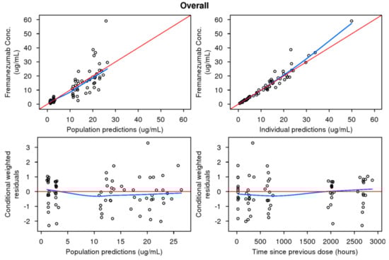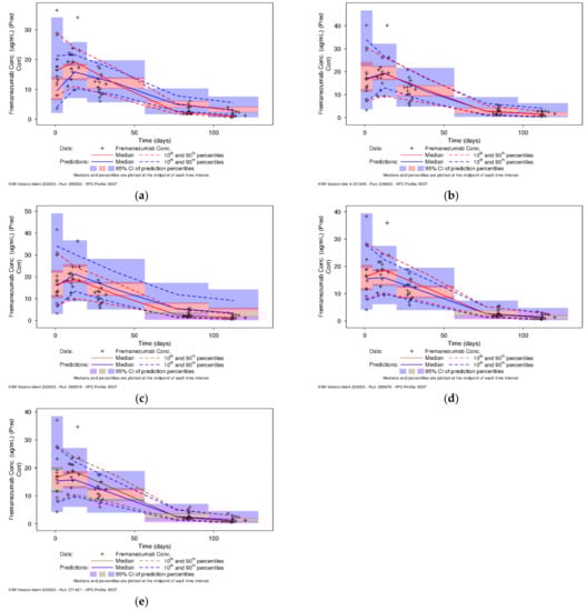 The pcVPC method was performed using the final pediatric population PK model to ensure adequate model performance and to assess the predictive capabilities of the model. The median and 90% prediction interval, derived from the simulated datasets, overlaid on the observed fremanezumab concentration data in pediatric patients and corresponding percentiles, are provided in Figure 1b, which was previously published [29]. In general, the pcVPC results indicate that the model adequately predicts both the central tendency of the concentration data over time as well as the extent of variability in the observed pediatric data.