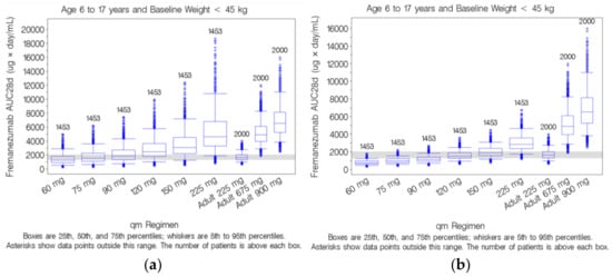 Simulated steady state fremanezumab AUC28d for pediatric patients 6 to 17 years of age with baseline body weight <45 kg compared to the adult distribution following fremanezumab 225 mg subcutaneous monthly administration based on different revisions to the pediatric population pharmacokinetic model: (a) fixed allometric exponents 1, (b) bioavailability and lag time fixed to adult values 1. AUC28d: area under the concentration time curve from time 0 to 28 days, qm: monthly. 1 Subfigures a and b were reproduced with permission from [29], SAGE Publications, 2021.