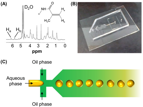 (A) 1H-NMR spectrum of GM. (B) A photo of the microfluidic device fabricated for microgel generation. (C) A schematic diagram depicting flow-focusing microfluidic geometry.