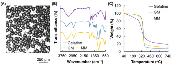 (A) A microscopic image of MM. (B) FTIR spectra of gelatine, GM and MM. (C) TGA curves of gelatine, GM and MM.