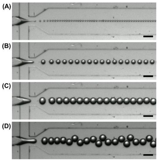 The size of MM fabricated at different Qaq/Qo values: (A) 0.05; (B) 0.1; (C) 0.2; (D) 0.3. The concentration of GM in the aqueous phase is 8% (w/v). Scale bar is 100 μm.