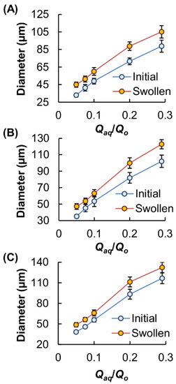 Changes in the average diameter of MM [(A) MM50, (B) MM65 and (C) MM80] upon changes in the Qaq/Qo value. The diameter was measured immediately after microgel fabrication and after swelling in PBS for 24 h.