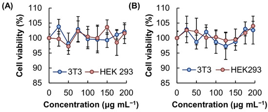 Viability of 3T3 fibroblasts and HEK 293 cells after 5 h treatment with MM, (A) before and (B) after 24 h post-treatment incubation.