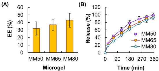 To evaluate the performance of the microgels in bioactive agent delivery, tetracycline hydrochloride was adopted as a model agent. Depending on the concentration of GM in the microgels, the EE was estimated to be around 30–40% (Figure 7A). Among the microgels tested, MM80 displayed the highest sustainability of agent release (Figure 7B). This was partially attributed to the fact that, under the same Qaq/Qo value, microgels generated from a pre-gel solution containing a lower concentration of GM have a smaller size. Because a reduction in the particle size may cause a decrease in the diffusion length and an increase in the SA:V value [20,21,22,23], this favours the diffusion of the loaded molecules from the microgels to the surrounding medium and hence reduces the sustainability of agent release [24].