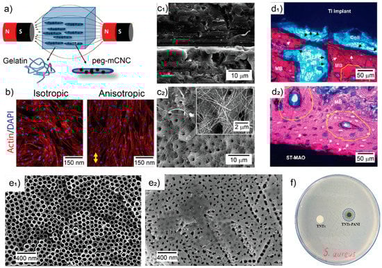 Scaffolds combining synergistic physicochemical cues for TERM. (a) Schematic representation of anisotropic hydrogel preparation and cross-linking under the influence of a uniform magnetic field. Rod-shaped nanocrystals coated with MNPs, polydopamine and polyethylene glycol were employed to generate a gelatin hydrogel with directional microstructure and anisotropic mechanical properties. (b) Effect of isotropic and anisotropic hydrogels on human adipose tissue derived stem cells alignment after 3 days of culture (red, cytoskeleton; blue, nucleus). (c1,c2) SEM images of Ti implant and steam hydrothermal treated microarc oxidation coated Ti (ST-MAO), respectively. (d1,d2) Bone histology and histomorphometry around the Ti and ST-MAO implants, respectively, after 12 weeks of healing. (MB) mineralized bone; (black arrow) osteoblasts; (white arrow) osteocytes; (Coll) collagen birefringence; (yellow ring) osteon. (e1,e2) Field Emission-SEM TNTs and TNTs coated with PANI, respectively. (f) Antibacterial effect showing zone of inhibition on S. aureus. (a,b) adapted with permission from [133], American Chemical Society, 2019. (c1–d2) adapted with permission from [134], American Chemical Society, 2015. (e1–f) adapted with permission from [135], Elsevier, 2018.