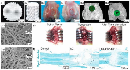 Incorporating various therapeutic molecules such as antibiotics and growth factors within the scaffold has been also explored as means to enhance tissue engineering functionalities. For example, Escobar et al. reported the use of mesoporous titania films for gentamicin loading and release to prevent Staphylococcus aureus colonization. In addition, these mesoporous materials were surface functionalized with BMP-2 to promote MC3T3 preosteoblastic cell line proliferation and differentiation [142]. In reference [141], Zhang et al. developed a multifunctional nanofiber scaffold encapsulating glucocorticoid methylprednisolone as an immunomodulatory drug for treatment of spinal cord injury. Using the electrospinning technique, the authors combined PCL and polysialic acid (a natural, biodegradable polysaccharide capable of controlling central nervous system development by modulating cell adhesion and promoting axonal growth), and methylprednisolone (a drug capable of inhibiting spinal cord early secondary inflammation and lipid peroxidation). The nanofiber scaffold was biodegradable (Figure 2(d1,d2)), biocompatible and could sustain the local release of methylprednisolone, which would bypass the severe adverse effects of high systemic dosage. Scaffolds were transplanted into spinal cord transection lesion sites in rat models (Figure 2e). The nanofiber scaffolds were effective in suppressing tissue acute inflammation (decreased levels of tumor necrosis-α and interleuquin-6), apoptosis, and attenuating glia scar formation. Moreover, the scaffolds inhibited axonal demyelination, promoted axonal regeneration, and improved functional outcome (Figure 2f).