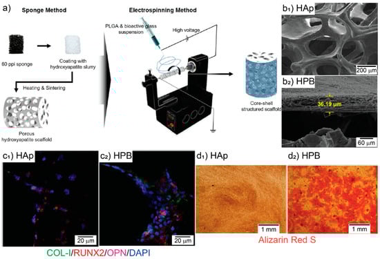 Scaffold combining synergistic physicochemical and biochemical cues for TERM. (a) Schematic representation of the fabrication of porous HA scaffolds covered with a BG-containing PLGA fiber layer (HPB). (b1,b2) Representative SEM images of porous HA and HPB scaffolds, respectively. The thickness of BG-containing PLGA microfibers is shown. (c1,c2) Osteogenic activity of MC3T3-E1 cells cultured on HA and HPB scaffolds, respectively. Immunocytochemical analyses of the osteogenic protein expression level of Col I (COL-I, green), runt-related transcription factor 2 (RUNX2, red) and osteopontin (OPN, magenta) following culture for 14 days. (d1,d2) Alizarin red staining performed to observe mineralization of MC3T3-E1 cells by ions released around HA and HPB scaffolds, respectively, on day 21. (a–d2) adapted with permission from [154], American Chemical Society, 2019. Further permissions to the related material should be directed to the ACS.