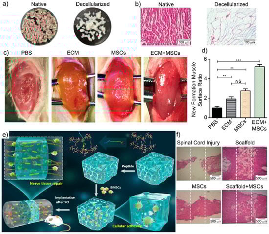 Synergistic approaches combining multifunctional scaffolds with cell-based therapy for TERM. (a) Representative optical images of native and decellularized heart tissue. (b) Masson’s trichrome staining confirming absence of cells and cell debris in the matrix after decellularization. (c) Gross appearance of the volumetric muscle loss injury in four groups and (d) surface ratio of new muscle fibers formed in each group. MSCs and ECM scaffold have a synergistic effect promoting muscle tissue regeneration. Data shown as mean ± SD. ** p < 0.01; *** p < 0.001; NS, not significant (p > 0.05). PBS phosphate buffer saline. (e) Scheme of the adhesive peptide modified hyaluronic acid scaffold loaded with bone marrow MSCs for spinal cord injury repair. (f) H&E staining of nontreated tissues (spinal cord injury) and tissues embedded with implants at 4 weeks postsurgery. Encapsulation of MSCs significantly improved nerve tissue reconnection effect of the scaffold. (a–d) adapted from [159], BioMed Central, 2018. (e–f) adapted with permission from [161], American Chemical Society, 2017.
