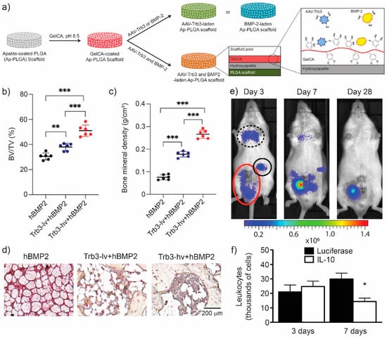 Synergistic approaches combining multifunctional scaffolds with gene or immune therapy for TERM. (a) Schematic diagram of scaffold fabrication through coating gelatin-conjugated caffeic acid (GelCA) onto the surface of apatite-PLGA (Ap-PLGA) scaffold. The GelCA-coated hybrid biopolymer scaffold was adopted to deliver adeno-associated viruses-encoding Trb3 or/and recombinant BMP-2 protein. (b–d) Promotion of bone formation (b,c) and fat-filled cyst formation inhibition in rat critical-sized mandibular defects 12 weeks after scaffold implantation loaded with high dose BMP-2 (hBMP2) and/or low and high dose adeno-associated viruses-encoding Trb3 (Trb3-lv and Trb3-hv, respectively). (b) Bone volume/tissue volume percentage. (c) Bone mineral density. Values represent mean ± SD: ** p < 0.01 and *** p < 0.001 using one-way ANOVA test. (d) Oil red immunohistochemical stain showing fewer adipocyte-like cells in area of defects treated with high dose AAV-Trb3 and BMP-2 than with BMP-2 alone. (e) Transgene expression in vivo. Representative bioluminescence images at days 3, 7, and 28 postimplantation of scaffolds loaded with luciferase lentivirus and implanted into the right intraperitoneal fat pad. Color bar indicates radiance (p/sec/cm2/sr). (f) Leukocyte infiltration into IL-10 virus releasing scaffolds. Number of CD45 positive cells isolated from scaffolds loaded with IL-10 or luciferase virus at day 3 and day 7 post implantation. * p < 0.05 versus day 7 luciferase. (a–d) adapted with permission from [164], Elsevier, 2020. (e–f) adapted with permission from [165], Elsevier, 2013.