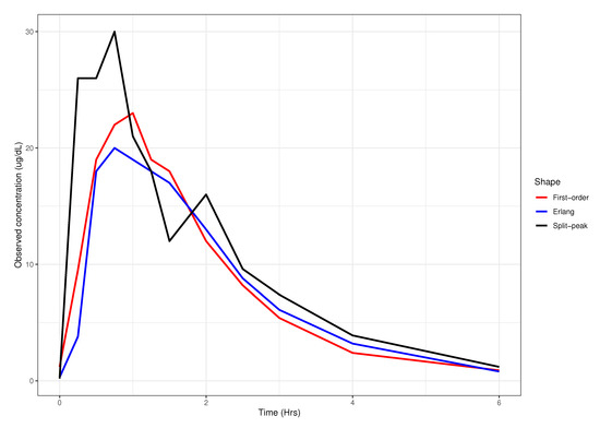 The data used for this study are previously described in a nonlinear mixed-effects analysis of cortisol [12]. Briefly, after the study was approved by the University of Minnesota Institutional Review Board (Project 1209M21101 approved on 5 July 2017). Following each subject’s morning dose at 0800, 12 concentrations were obtained at times 0 (Predose), 0.25, 0.5, 0.75, 1, 1.25, 1.5, 2, 2.5, 3, 4, and 6 hours after the dose. Concentration-time data consisting of 682 cortisol observations from 53 patients were available. Post-publication, we visually assessed the concentration-time data and assigned each individual as having either a first-order absorption process (n = 20), absorption consistent with an Erlang distributed delay model (n = 21), or a split-peak absorption process (mixed first-order, and Erlang models; n = 12) [13] These absorption patterns are exemplified in Figure 1.