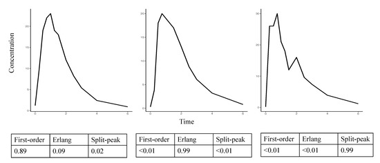 Figure 4 presents the output from three representative profiles (first-order, Erlang, and split-peak) demonstrating the probabilities of each absorption profile.