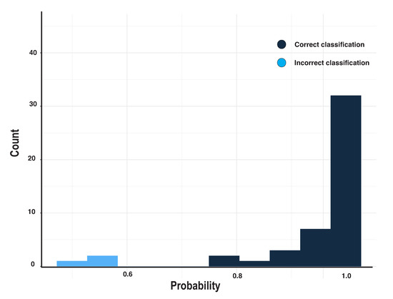 Probability counts for DNN model prediction. Dark blue presents the correct classification; Light blue presents the incorrect classification.