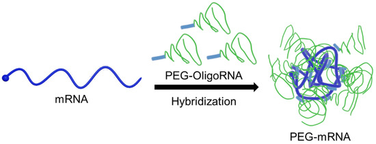 Chemical modification of nucleotides in mRNA is an effective method to improve the bioavailability of mRNA, especially to reduce the immunogenicity of mRNA [21,22,23]. However, currently used chemical modifications provide minimal protection of mRNA against RNases under physiological conditions [24]. Thus, additional methods are needed to modify mRNA without using cationic materials. Recently, we reported an innovative technology to functionalize mRNA through hybridization with complementary RNA oligonucleotides (OligoRNAs) equipped with a desired moiety [25,26,27]. Fine-tuning of the complementary length of OligoRNA sequences, specifically 17 nt of complementary length, enables mRNA modification without decreasing mRNA translational activity and without inducing an immune response caused by double strand RNA (dsRNA) regions. Ultimately, we demonstrated the utility of this approach to improve the functionalities of polycation-based mRNA delivery systems. In this study, we employed this method to improve RNase resistance without using cationic materials by directly PEGylating mRNA (PEG-mRNA) using 17 nt OligoRNAs possessing a PEG strand (PEG-OligoRNA) (Figure 1). The PEG strands surrounding the mRNA were expected to reduce non-specific interaction with charged macromolecules in physiological conditions, leading the inhibition of unpreferable recognition by RNases for efficient mRNA delivery. Indeed, PEG-OligoRNA hybridization with mRNA enhanced the tolerability against RNases and eventually improved the introduction efficiency of PEG-mRNA in cultured cells. For future clinical application, it is important to note that our system is composed only of mRNA and PEG, which has already been approved for clinical usage in many drugs. On the other hand, clinical approval of new materials requires laborious processes, except when a pandemic situation prompts approval for emergency usage.