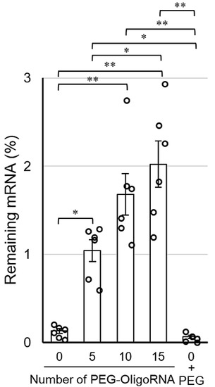 Remaining amount of mRNA after incubation in 1% FBS solution for 15 min. Data are shown as average mean ± SEM. Each dot refers to an individual measurement (n = 6). Statistical difference was analyzed by ANOVA followed by Tukey’s test. Abbr., 0 + PEG: 0*PEG-mRNA in the presence of free PEG strands. * p < 0.05, ** p < 0.01.