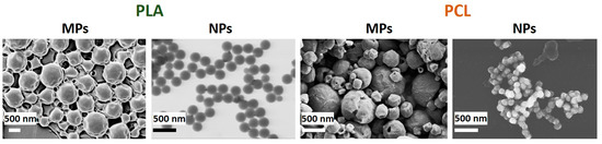 Characteristics of PLA- and PCL-based particles. PLA = poly(L-lactic acid), PCL = poly(ε-caprolactone), MPs = microparticles, NPs = and nanoparticles.