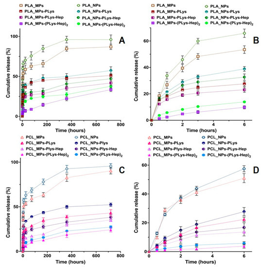 The prednisolone release from modified particles visibly differs from that observed for initial particles. Moreover, the increase in polyelectrolyte layer thickness on the surface of polyester-based particles diminishes the rate of release. It is also interesting that non-modified PLA/PCL-based MPs and NPs possess an initial “burst” drug release stage. More than 50% of prednisolone rapidly dissolves at this stage during first 2–3 h (Figure 3B,C). Introduction of PLys- and Hep-based polyelectrolyte layers on the surface of the particles minimize such a “burst” release stage (Figure 3). Notably, the particles covered by two layers of polyelectrolytes, (PLys-Hep)2, show even a release profile, without an initial “burst”. This could be referred to the action of two factors, namely, a decrease in the drug loading due to leakage of the drug during modification and formation of the hydrophilic layer on the particle surface. This layer could serve as an additional barrier for drug diffusion, which helps to prolong the drug release (Figure 4).