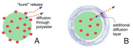 The scheme showing the difference between drug release from non-modified (A) and modified (B) particles.