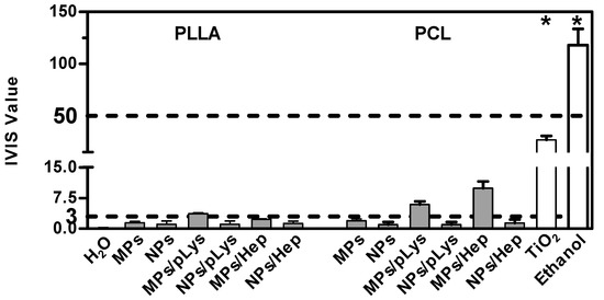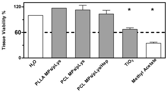 As a more toxic effect was shown at the higher concentration in the previous tests on cells, both assays were performed with all samples at the concentration of 0.5%. The BCOP assay was first performed due to its simplicity and inexpensiveness, and an in vitro irritation score (IVIS) was calculated to classify the test substance into “No Category” (≤3), “No prediction can be made” (>3; ≤55) and “Category 1”, inducing serious eye damage (>55), as defined by the United Nations Globally Harmonized System of Classification and Labelling of Chemicals (UN GHS). As shown in Figure 7, distilled water and methyl acetate were applied as negative and positive controls, and titanium dioxide nanomaterials as a nanoparticulate reference. PLA MPs-PLys, PCL MPs-PLys, PCL MPs-PLys-Hep and TiO2 were categorized as “no prediction can be made”, while all other particles fell into the “no category”, suggesting no eye irritation potential. Subsequently, the EpiOcular test was performed to distinguish substances when no prediction can be made. The final evaluating criteria for the EpiOcular test is tissue viability, where above 60.0% is relative to the negative control non-irritant and below 60.0% is an irritant. All the particles presented a tissue viability above 60%, indicating that no irritancy can be predicted, although TiO2 nanoparticles showed a broader line irritancy [30]. Combining the results from both assays, all polyester particles were predicted to not be an eye-irritant, which is in accordance with the RBC test result.