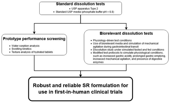 In the present study, we describe the development of a robust SR matrix tablet with a novel G-protein-coupled receptor 40 (GPR40) agonist for first-in-human studies. The main aim of this paper is to propose a general workflow for the successful development of a novel SR tablet with an innovative API. The proposed step-by-step approach focuses on employing various analytical methods, including tablet swelling and water uptake analysis, through standard USP compliant dissolution tests, and sophisticated physiology-driven biorelevant dissolution tests. This novel pathway may be useful for the effective and reliable characterization of a robust SR formulation and offers a reliable prediction of in vivo pharmacokinetics.