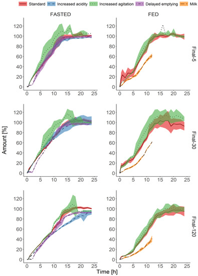 Increased agitation during the experiment caused greater dissolution also under simulated fed conditions (Figure 5). Similarly to the fasted conditions, the 120 mg dose was the least prone to the simulated stress events. The dissolution kinetics differed to the greatest extent when the media consisted of milk with digestion enzymes. At each time point, the cumulative amount of the API was lower in comparison with “Standard” and “Increased agitation” protocols. The experiment conducted in milk took twelve hours only. Therefore, the prediction of the maximum cumulative amount released within 24 h was impossible.
