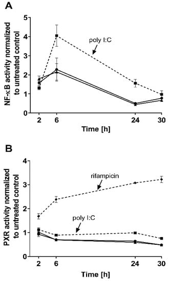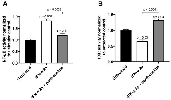 IFN-α 2a clearly activated NF-ĸB during the first 6 h and diminished it below baseline after 24 h or 30 h of continuous exposure (as illustrated in Figure 1A). Such a biphasic kinetic response with an observed activity peak within the first hours is typical for NF-ĸB activation by immunological stimuli [36,37,38]. Concurrently, IFN-α 2a-mediated activation of NF-ĸB was accompanied by suppression of PXR activity (as illustrated in Figure 1B). The involvement of NF-ĸB in the PXR response was further confirmed by showing that the NF-ĸB inhibitor parthenolide blunted IFN-α 2a-mediated NF-ĸB activation and concurrently prevented PXR suppression (as illustrated in Figure 2). Parthenolide in fact slightly overcompensated the PXR-suppressive effects of IFN-α 2a, but enhancement of basal PXR activity by strong NF-ĸB inhibition was already observed previously [19].