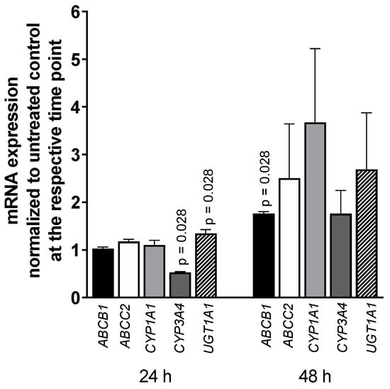 Exposing LS180 cells to 5000 U/mL IFN-α 2a for 24 h or 48 h reduced the mRNA level of CYP3A4 (0.52-fold compared to that of untreated control; p = 0.028), whereas UGT1A1 was increased (1.35-fold; p = 0.028) after 24-h exposure as was ABCB1 after 48 h (1.76-fold; p = 0.028) (as illustrated in Figure 3). All other genes or time points did not reach statistical significance. The positive control rifampicin (20 µM) increased mRNA expression of ABCB1 (2-fold) after 24 h and 48 h (p = 0.0286) and CYP3A4 (5-fold, p = 0.0286) and UGT1A1 (2-fold, p = 0.0286) after 48-h exposure (data not shown; positive control data were published previously [35]).