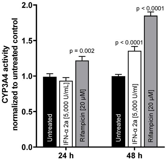 To test whether mRNA expression translates into activity changes, CYP3A4 metabolic activity was evaluated. While there was no effect after 24 h, IFN-α 2a (5000 U/mL) enhanced CYP3A4 activity after 48 h (1.35-fold compared to that of untreated control; p < 0.0001). The positive control rifampicin (20 µM) enhanced CYP3A4 activity at both time points (24 h: 1.21-fold, p = 0.002; 48 h: 1.85-fold, p < 0.0001) (as illustrated in Figure 4).