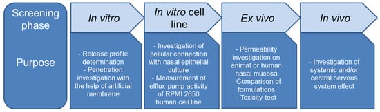 In the case of nasal formulations, the uniformity of mass, the API content, or particle size should be investigated, but the penetration extent is also a key property. Recently, screening methods exist which are able to give information about the adaptability of a nasal pharmaceutical preparation, thereby reducing the risk of human clinical investigations. A general penetration investigation protocol of a pharmaceutical nasal composition is proposed in Figure 1.