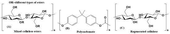 The chemical structure of the membranes: (A) Metricel®, (B) Isopore™, and (C) Whatman™.