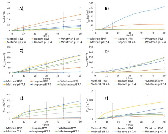 As it is poorly water-soluble (with the highest logP value among the model APIs), IPM impregnation affected its ability to diffuse to the acceptor phase with the highest efficiency compared to soaking with PBS. It tended to cross the IPM-impregnated membrane, thus causing a higher diffusion rate and API concentration in the acceptor phase (Table 6).