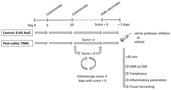 A well-characterized 2,4,6-trinitrobenzene sulfonic acid (TNBS)-induced post-colitis rat model for visceral hypersensitivity was used in this study [,,]. The experimental course is shown in Figure 1. Details on the procedures are given in subsequent paragraphs. After acclimation, an enema containing TNBS was used to induce a mild colitis, whereas control rats received an enema containing saline. The presence and severity of acute colitis were scored colonoscopically 3 days later. Subsequently, a colonoscopy was performed starting from day 10 and repeated every 4 days until complete mucosal healing was observed. Then, electromyographic (EMG) electrodes were implanted in the abdominal musculature of the rat and exteriorized at the scapular region. Three days later, the serine protease inhibitor UAMC-00050 or its vehicle was given intracolonically. Thirty minutes after the single administration of the drug, visceral sensitivity to colorectal distensions and colonic compliance were evaluated. Finally, animals were sacrificed (exsanguination under pentobarbital anesthesia, 45 mg/kg i.p.) and inflammatory parameters (colonoscopy, macroscopy, microscopy, and myeloperoxidase (MPO) activity) were scored to confirm the post-inflammatory state of the animal and to evaluate effects of the compound on mucosal inflammation. Colonic and fecal samples were taken for the assessment of proteolytic activities using selective fluorogenic substrates. Pharmacokinetic experiments were performed in a separate group of rats.