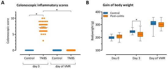 Drug allocation during the experiments was randomized for all rats. We did not observe significant differences in the clinical course of the colitis (e.g., colonoscopic inflammatory scores at day 3, duration of the colitis, and gradual increases in body weight) between the post-colitis animals that were allocated to different treatment groups (Table 2).