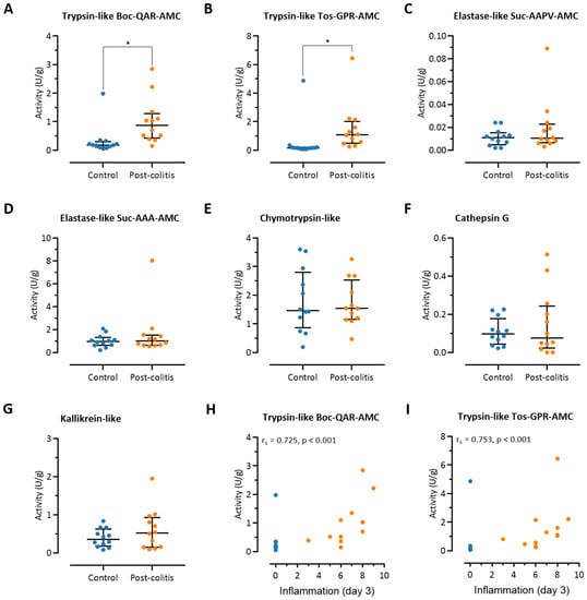 Trypsin-like activity was significantly increased in full-thickness samples taken from the distal colon of post-colitis rats in two assays assessing the cleavage of two trypsin substrates, Boc-Gln-Ala-Arg-AMC and Tos-Gly-Pro-Arg-AMC, compared to healthy controls (0.87 (0.49–1.16) U/g versus 0.18 (0.25–0.12) U/g, p < 0.01 and 1.08 (0.54–1.73) U/g versus 0.16 (0.13–0.19) U/g, p < 0.01, respectively, n = 12 per group, Figure 3A,B). Chymotrypsin-like, cathepsin G, elastase-like, and kallikrein activities were comparable in post-colitis and control animals (Figure 3C–G). Interestingly, the trypsin-like activity in the colonic tissue strongly correlated with the severity of inflammation in the acute phase of colitis at day 3 (rs = 0.725, p < 0.001 for the Boc-Gln-Ala-Arg-AMC substrate and rs = 0.753, p < 0.001 for the Tos-Gly-Pro-Arg- AMC substrate, Figure 3H,I). No significant correlations were found for the other proteolytic activities (data not shown).