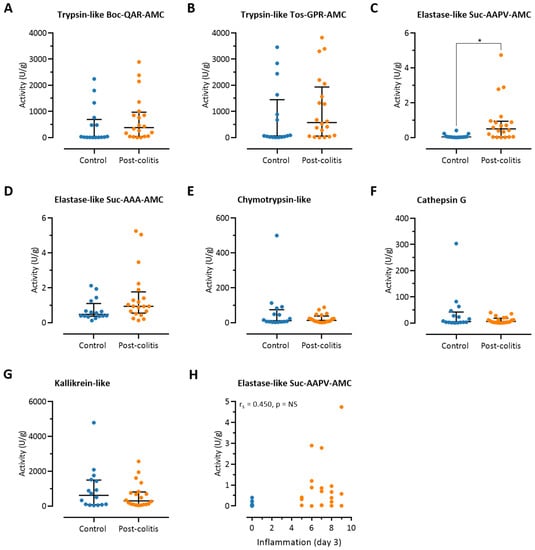 Proteolytic activities in fecal samples of post-colitis and control rats. (A) Trypsin-like activity assessed using Boc-Gln-Ala-Arg-AMC. (B) Trypsin-like activity assessed using Tos-Gly-Pro-Arg-AMC. (C) Elastase-like activity assessed using Suc-Ala-Ala-Pro-Val-AMC. (D) Elastase-like activity assessed using Suc-Ala-Ala-Ala-AMC. (E) Chymotrypsin-like activity. (F) Cathepsin G activity. (G) Kallikrein activity. Proteolytic activities were analyzed using Mann–Whitney U tests with Bonferroni correction for multiplicity; n = 16–20 per group. Data are presented including the median and IQR. (H) Correlation between the severity of inflammation in the acute phase of colitis (day 3) and elastase-like activity using Suc-Ala-Ala-Pro-Val-AMC. Correlations were assessed using Spearman’s rank order correlation coefficient, employing the Holm–Bonferroni method to correct for multiplicity. Note: * p < 0.05, significantly different from control. NS, non-significant.