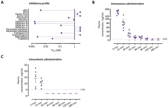 Pharmacokinetic properties of UAMC-00050. (A) Inhibitory profile of UAMC-00050 for a selection of proteases. IC50 > 2.5 µM, indicating non-efficient inhibition of the enzyme by UAMC-00050, are visualized as IC50 = 2.5 µM to allow for easier interpretation of the data. IC50 values were, in part, reproduced from Ceuleers and colleagues, with permission of the authors []. (B) Plasma concentrations after intravenous administration of UAMC-00050 (1 mg/kg), longitudinally collected, n = 7. Data are presented including means ± SEM. (C) Plasma concentrations after intracolonic administration of UAMC-00050 (5 mg/kg), longitudinally collected, n = 5. Data are presented including means ± SEM. LOQ, lower limit of quantification.